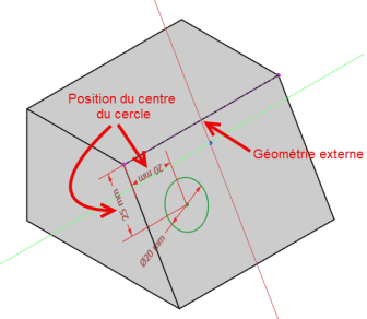 Une géométrie externe est une géométrie provenant d'un élément, sommet ou arête situé en dehors de l'esquisse.