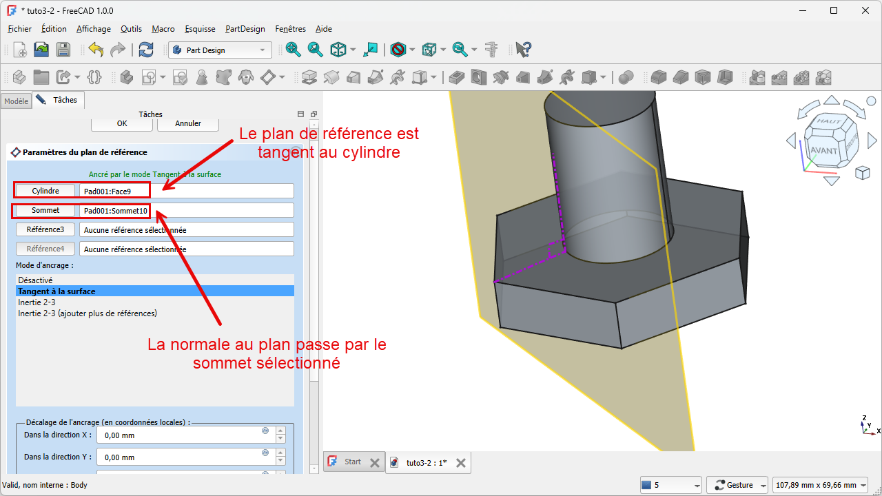Créer un plan de référence tangent à une surfaceProcédureSélectionner la surface ;⚓Sélection de la surfaceSélectionner un sommet ;⚓Sélection du sommetTruc & astuce - Ce sommet servira à positionner le plan tangent ;Sélectionner la commande ;⚓Sélection de la commande ;FreeCAD crée le plan de référence⚓Références et mode d'accrochageRemarque - Le sommet est utilisé pour positionner le plan de référence ;RésultatAjout du plan de référence dans Modèle