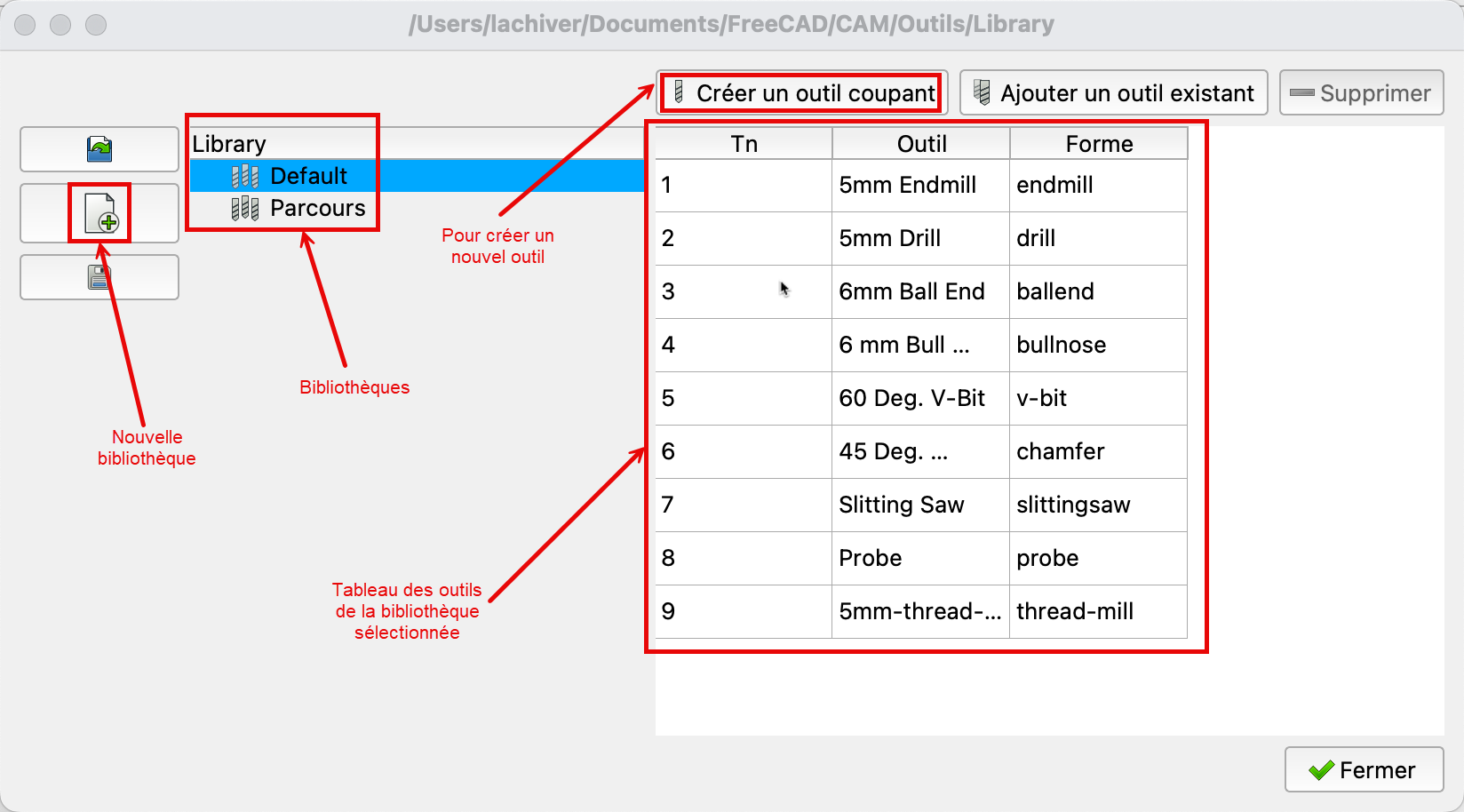Le Gestionnaire des outils coupantsW permet de créer, gérer, organiser les outils coupants dans FreeCAD.