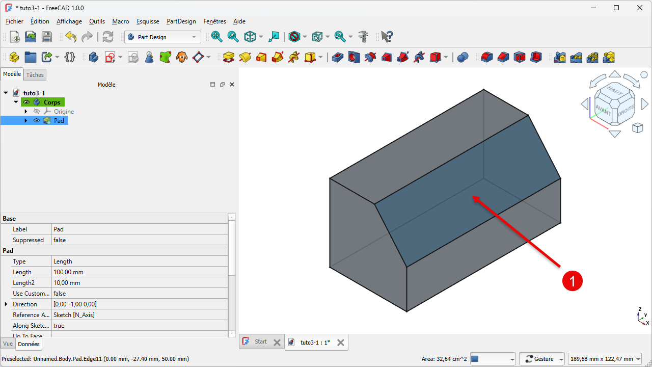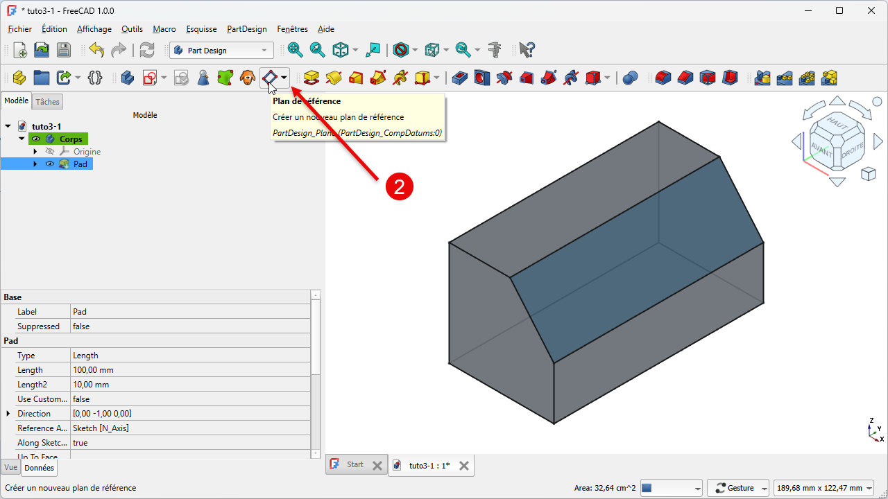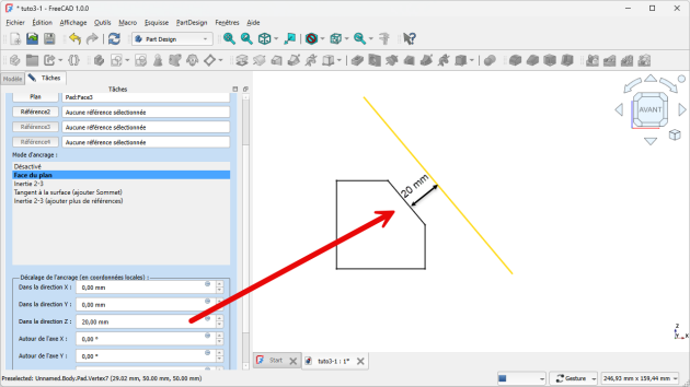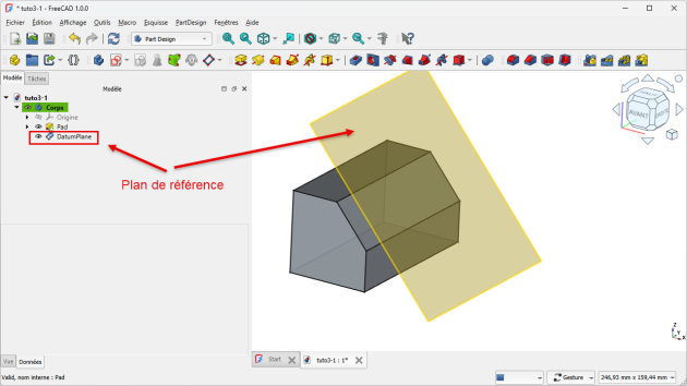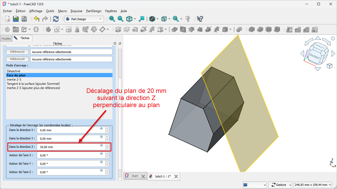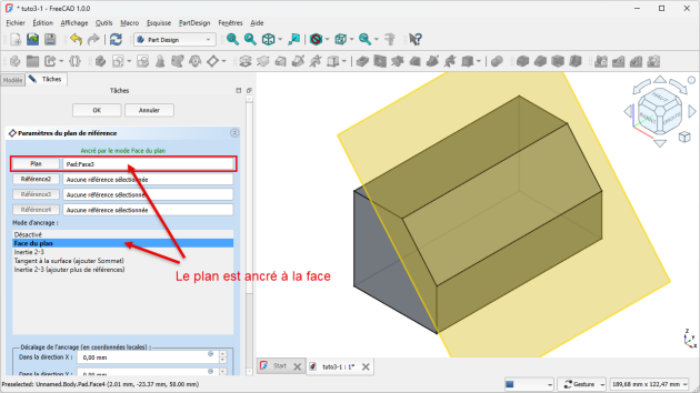 Créer un plan de référence parallèle à une faceProcédureSélectionner la face ;⚓Sélection de la faceSélectionner la commande ;⚓Sélection de la commande Plan de référence FreeCAD crée le plan de référence :⚓Référence et mode d'ancrage du plan de référenceDans l'onglet Tâche, décaler le plan⚓Décalage de l'ancrageFreeCAD décale le plan⚓Plan de référence décaléRésultatAjout du plan de référence dans la vue Modèle