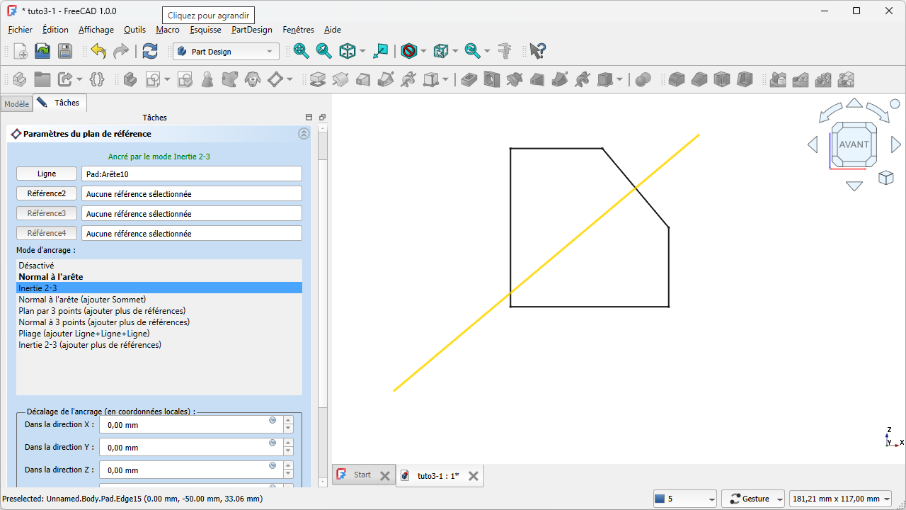 FreeCAD déplace le plan de référence au milieu de l'arête :⚓