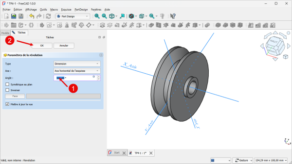 Part Design, sélectionner l’esquisseet créer une révolutionSketch