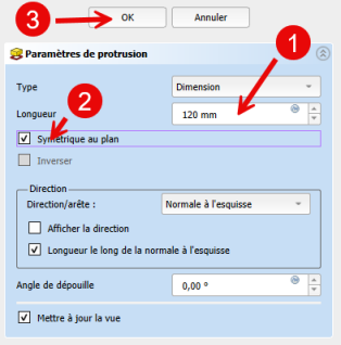 D'une manière générale, il faut utiliser le plus souvent possible les symétries des modèles : dans le cas présent, cela permettra de placer les trous et le trou oblong par rapport à ces axes de symétrie.