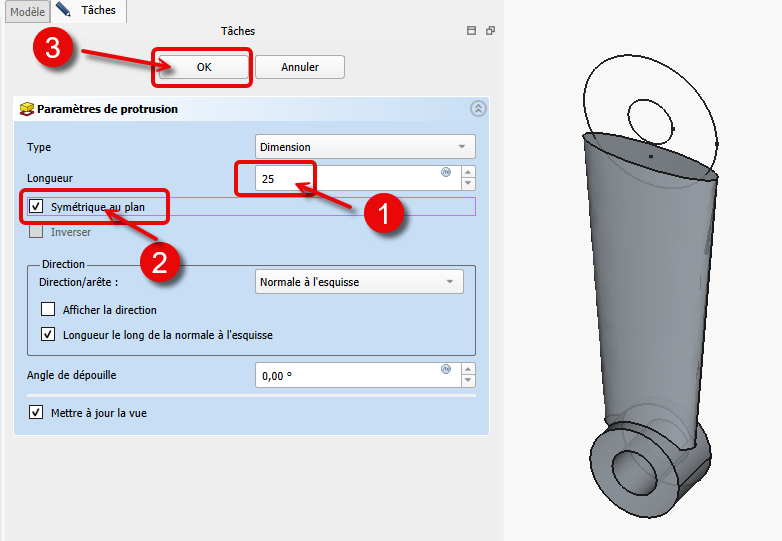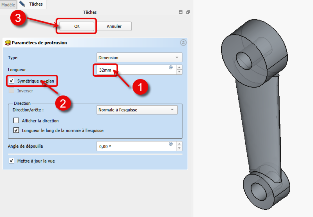 Création des cylindresTâches à réaliser - Taches à réaliser⚓Sélectionner l’esquisse CylInf et créer une protrusion symétrique de 25 mm ;Protrusion du cylindre inférieurSélectionner l’esquisse CylSup et créer une protrusion symétrique de 32 mm ;Protrusion du cylindre supérieur