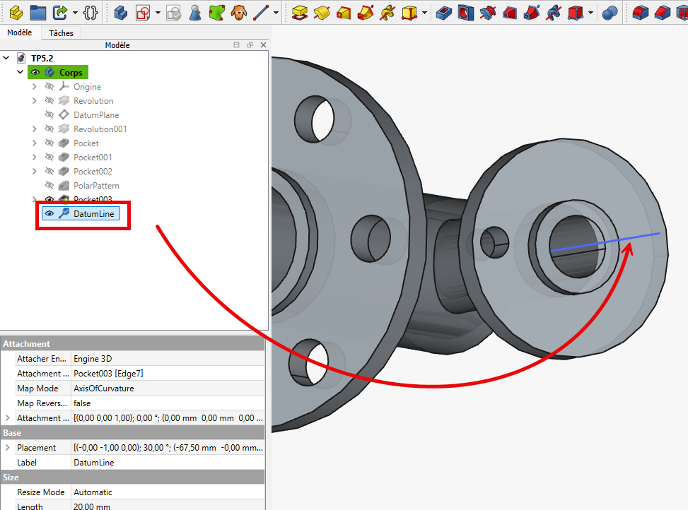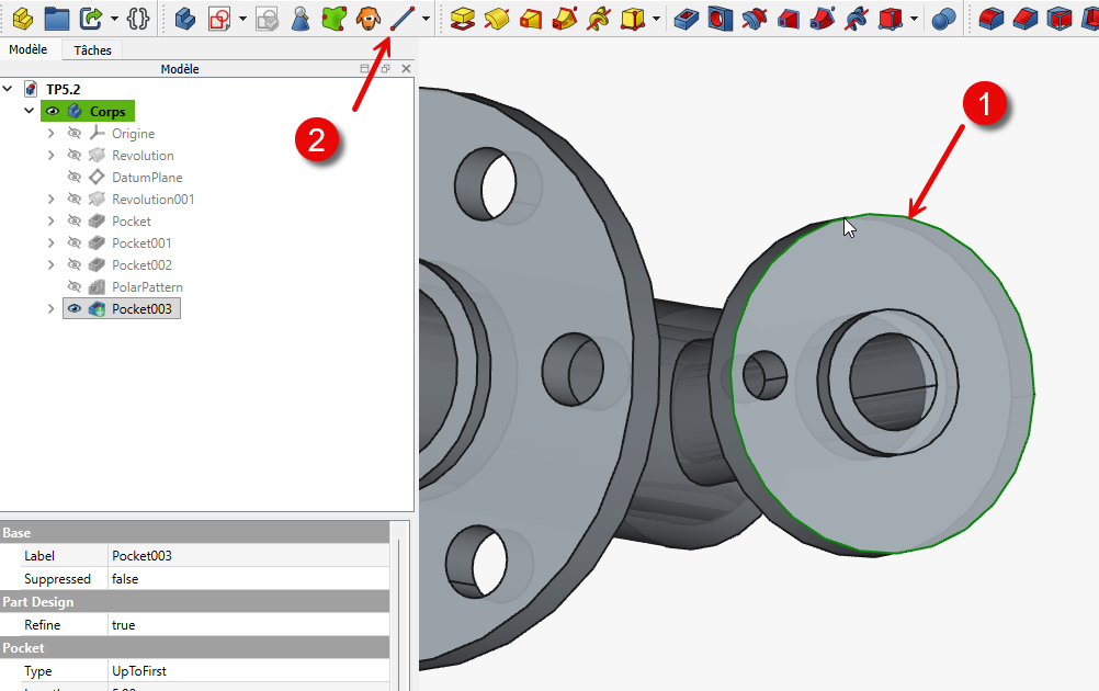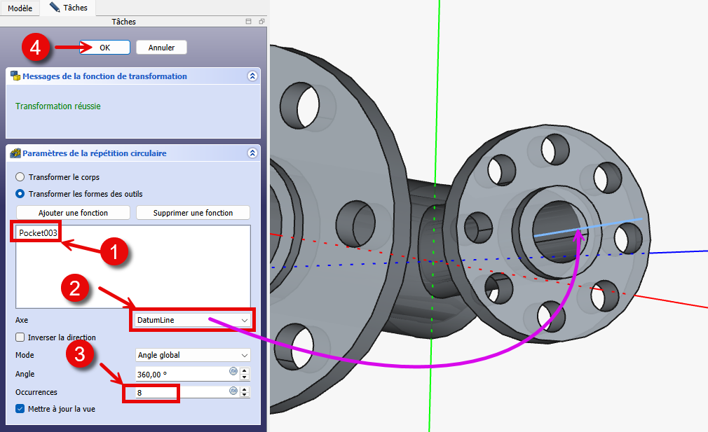 en sélectionnant la cavité créée avec 8 occurrences et en prenant la ligne de référence comme axe ;