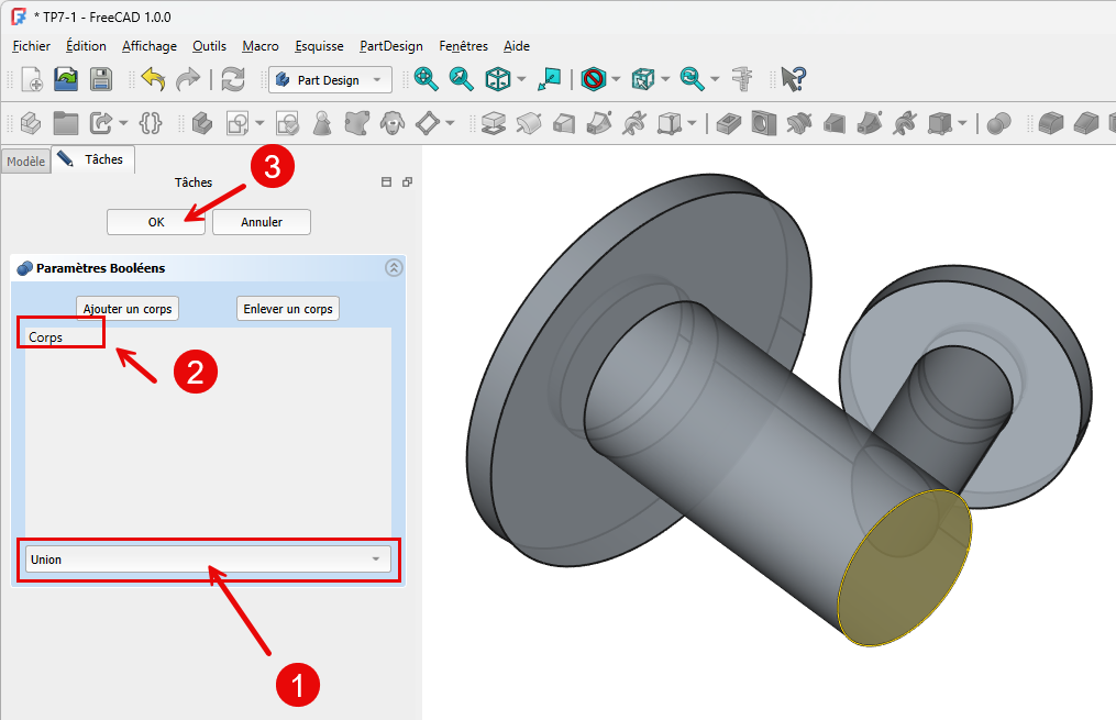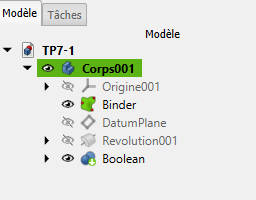 Fusionner les deux corpsTâches à réaliser - Tâches à réaliser⚓Sélectionner Corps001 dans la vue Modèle et fusionner le corps Corps à l'aide de la commande ;Opération booléenne : union des 2 corpsTruc & astuce - Noter les modifications dans la vue modèle⚓