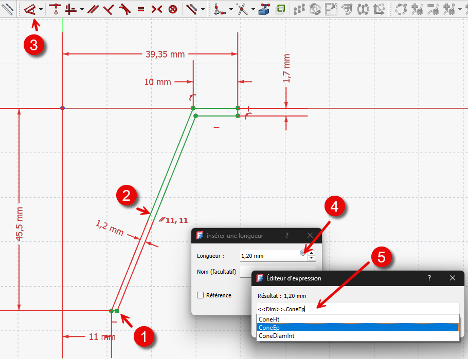 Dis: FreeCAD affiche la liste des alias qui commence par Dis : sélectionner l'alias souhaité à l'aide des flèches du curseur ;