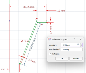 Sélectionner la ligne correspondant à la génératrice extérieure du cône et créer une référence que vous nommerez