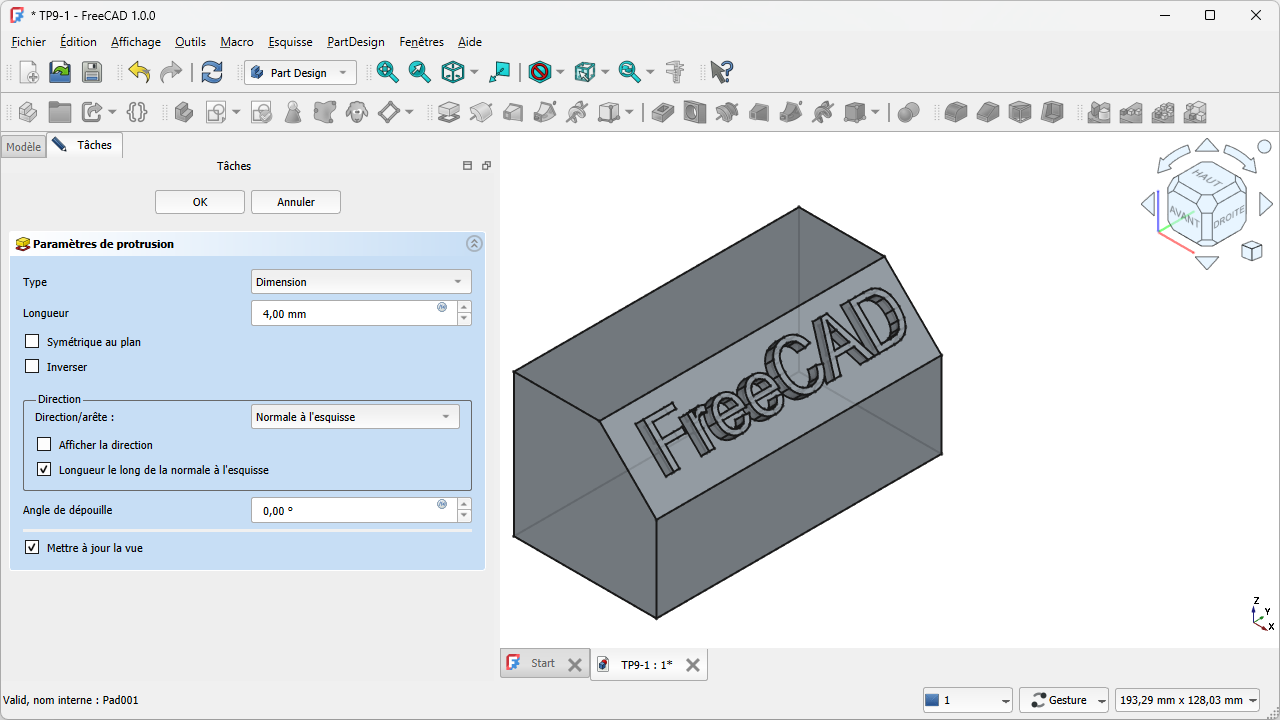 Sketch001et le modeFlatFace;Faire pivoter et centrer le mot FreeCAD en jouant sur l'attachement de l'esquisse ;