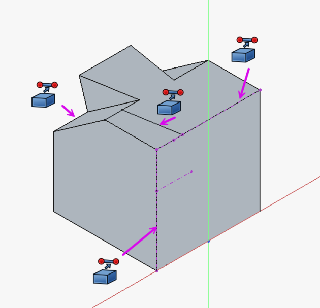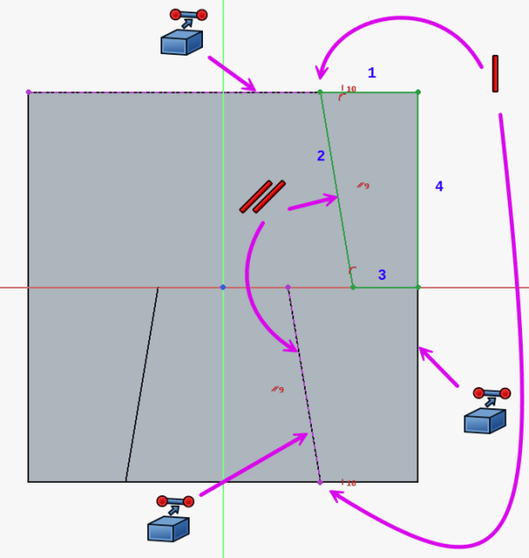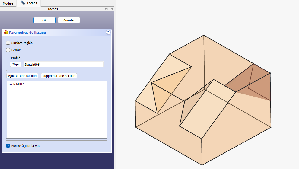 3ème lissage soustractifSketch006 ⚓Tâches à réaliser - Sélectionner la face de dessus et créer l’esquisse ci-dessous :Sketch006Sketch007 ⚓Tâches à réaliser - Sélectionner la face arrière et créer l’esquisse ci-dessous ;Sketch007Truc & astuce - Pour construire les géométries externes, basculer en vue isométrique ;Géométries externes pour Sketch007Pour construire la polyligne, revenir en vue arrière ;Lissage soustractif ⚓Tâches à réaliser - Sélectionner les deux esquisses et appliquer la commande Lissage soustractif ;