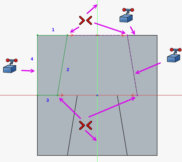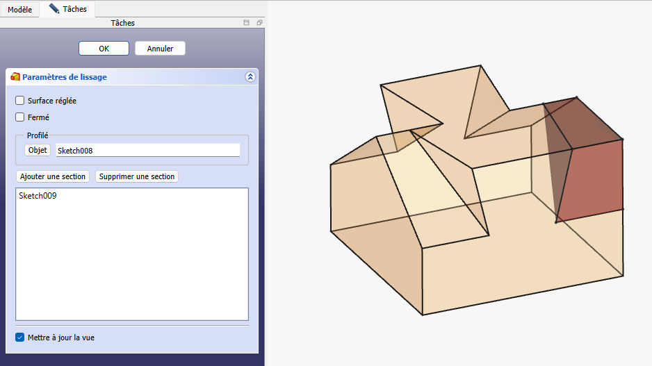 4ème lissage soustractifSketch008 ⚓Tâches à réaliser - Sélectionner la face du dessus et créer l’esquisse ci-dessous :Sketch008Sketch009 ⚓Tâches à réaliser - Sélectionner la face arrière et créer l’esquisse ci-dessous :Sketch009Lissage soustractif ⚓Tâches à réaliser - Sélectionner les deux esquisses et appliquer la commande Lissage soustractif ;