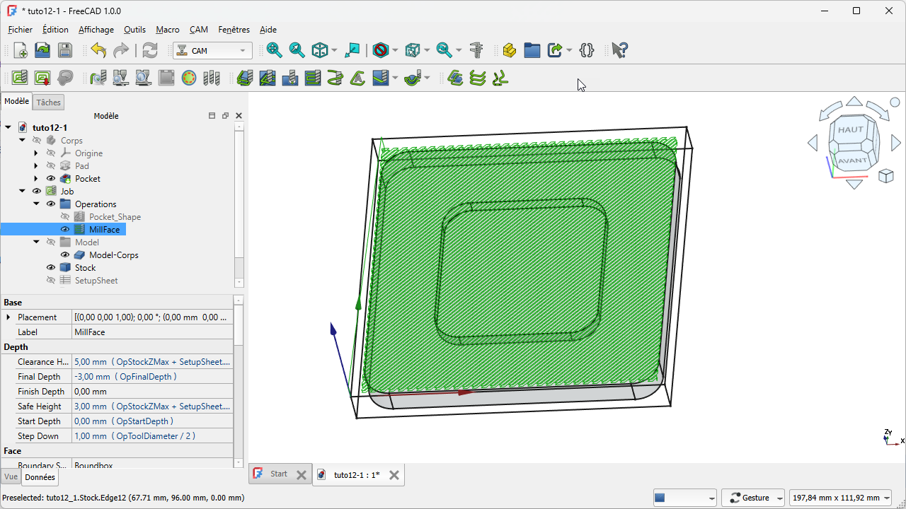 FreeCAD a ajouté un élément Poche MillFace dans le sous-dossier DossierOperation de Tâche de l'atelier CAM Job ;
