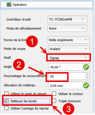 • Section Opération, saisir un motif Zigzag, un pourcentage de recouvrement de 50  et cocher nettoyer les bords ;