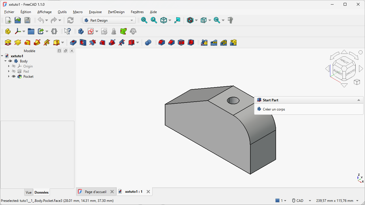 tuto1.FCStddans FreeCAD à l'aide de la commandeFichier → Ouvrirou du bouton;