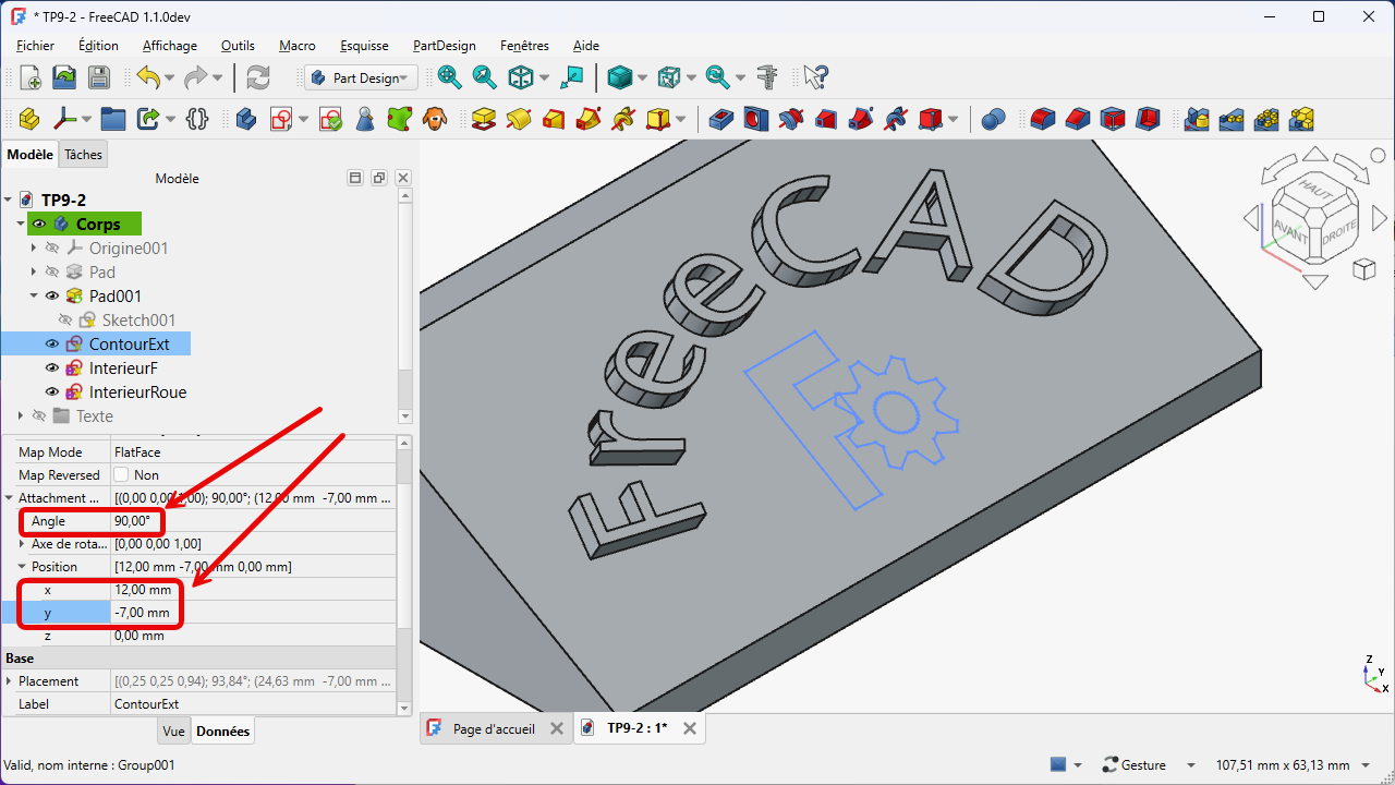 Repositionner l'esquisse sur le plan incliné en modifiant les propriétés de l'attachement : angle et positions x & y ;