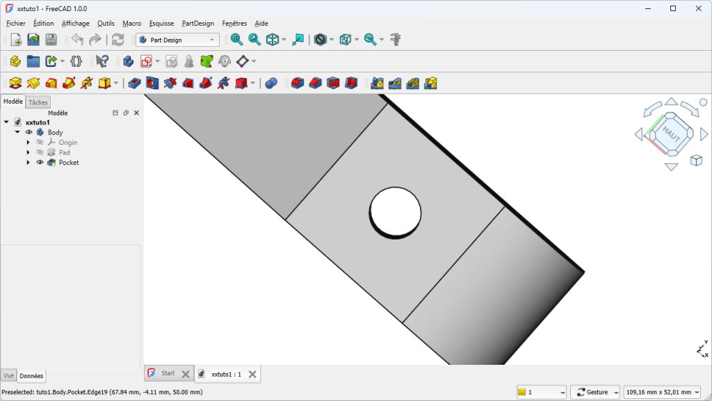 Clic gauche maintenu appuyé permet de pivoter (rotation) : FreeCAD visualise le centre de rotation à l'aide d'un cercle rouge ;