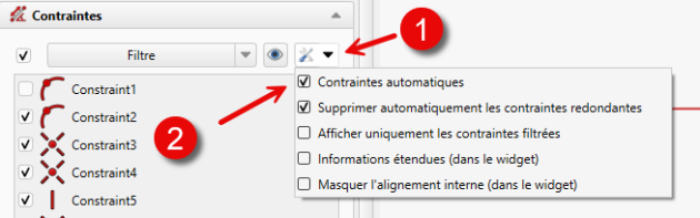 Contraintes permet d'activer / désactiver le réglage Contraintes automatiques ; Lorsque Contraintes automatiques est coché, lors de la création de nouveaux éléments géométriques (lignes, cercles…), certaines contraintes (ligne horizontale, ligne verticale, coïncidence, points sur objet…) seront ajoutées automatiquement.