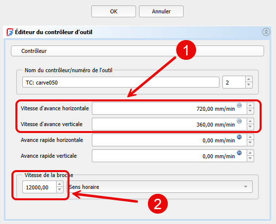 SetupSheetpour fixer le pas de descente àOpToolDiameter/2et modifier si nécessaire les hauteurs de dégagement, de sécurité et les vitesses d'avance rapide ;