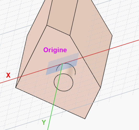 Si vous créez une nouvelle esquisse attachée à ce plan de référence, les axes X et Y seront alignés sur les cotés du plan incliné, l’origine décalée au point inférieur gauche du plan incliné :