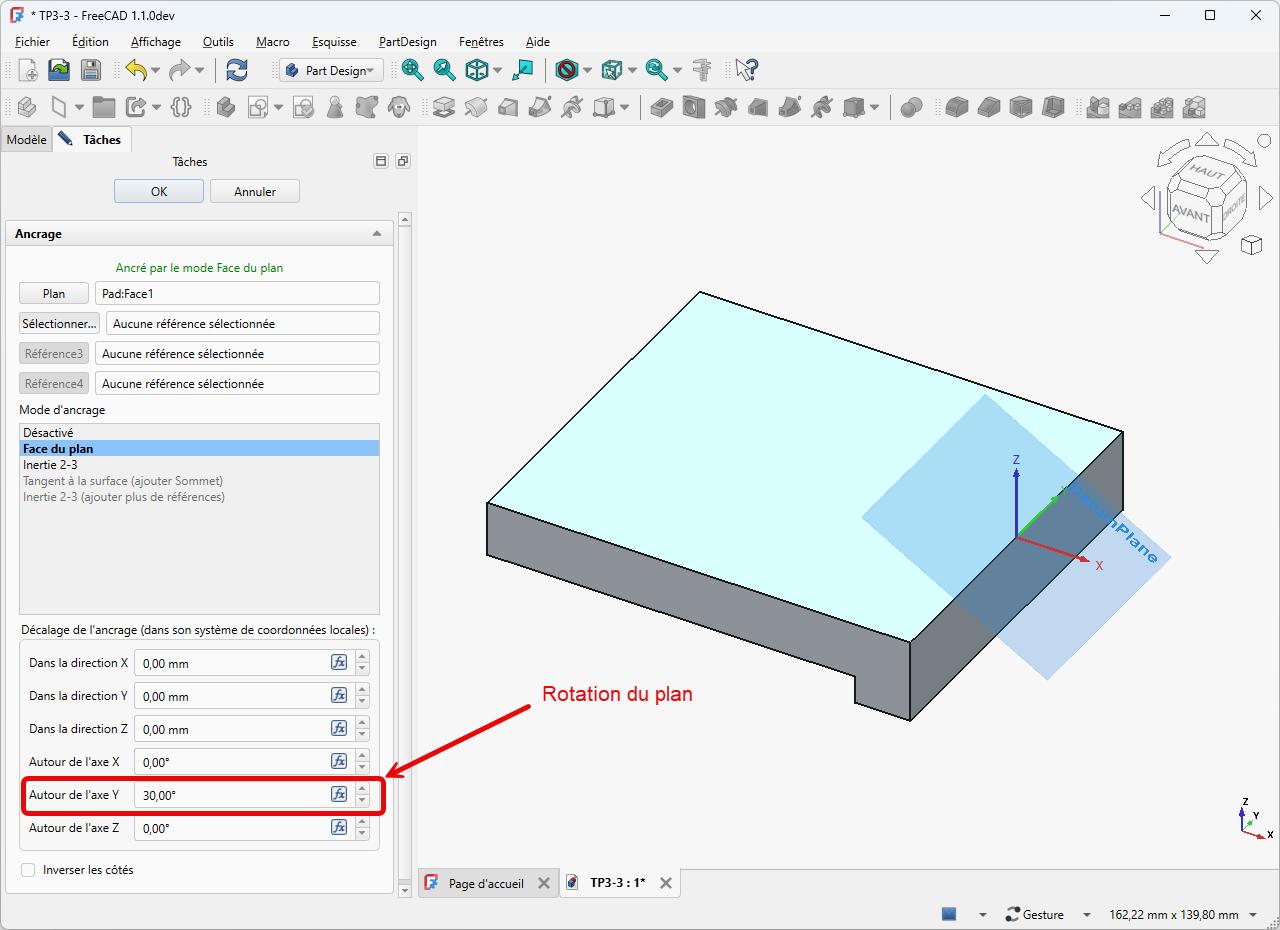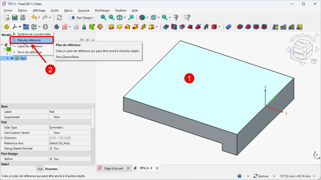 Sélectionner la face supérieure du Pad et sélectionner la commande Plan de référence (cliquer sur le bouton déroulant pour accéder à la commande la 1ère fois)