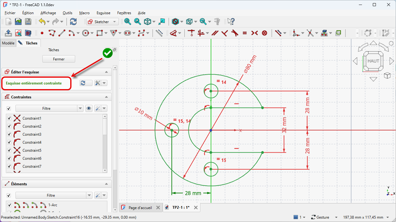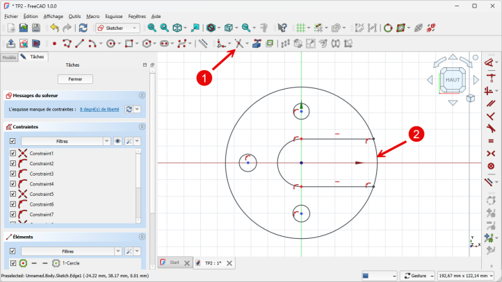 Déplacer légèrement une des 2 lignes horizontales et vérifier que le contour extérieur de l'esquisse est bien fermé ;