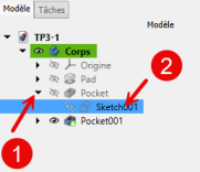 Modification du modèleGrâce à la modélisation paramétrique, il est très facile de modifier le modèle.Tâches à réaliser - Tâches à réaliser⚓Passer le rayon du trou oblong à 8 mm ;Truc & astuce - Aide⚓Dans la vue modèle, développer la branche Pocket ;Double-cliquer sur Sketch001 ;Sélection de l'esquisse à modifierDouble-cliquer sur la contrainte de rayon et modifier sa valeur à 8 mm ;Modification du rayon du trou oblong