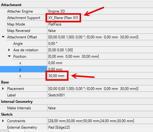 L’Attachment Offset (ou décalage d’attache) d’une esquisse dans l’atelier PartDesign correspond à un décalage et/ou une rotation supplémentaires appliqués par rapport au plan ou à la face sur laquelle l’esquisse est attachée.