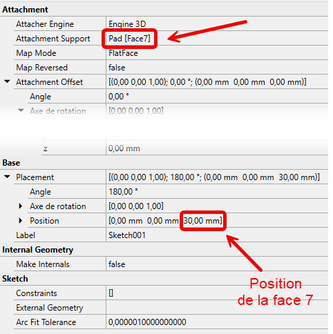 En choisissant la face supérieur du pad pour créer l’esquisse, FreeCAD a attaché l’esquisse à cette face : Face 7 de Pad ;
