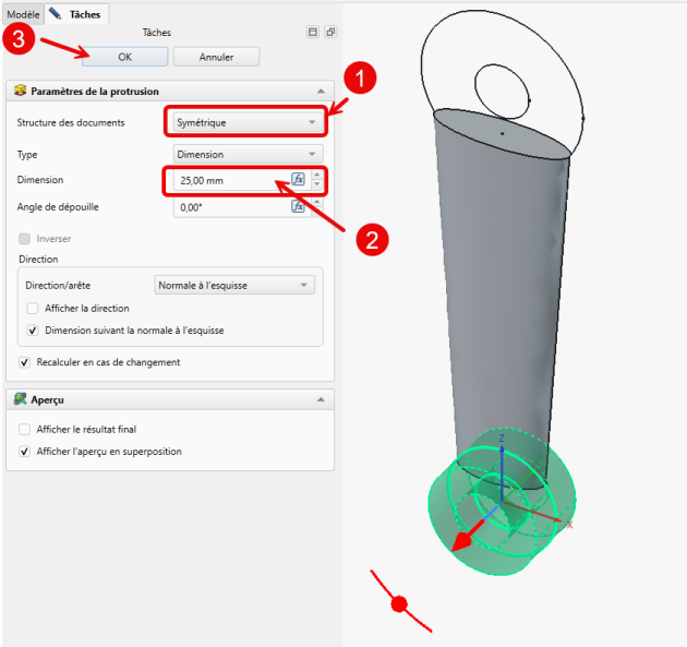 Création des cylindresTâches à réaliser - Taches à réaliser⚓Sélectionner l’esquisse CylInf et créer une protrusion symétrique de 25 mm ;Protrusion du cylindre inférieurSélectionner l’esquisse CylSup et créer une protrusion symétrique de 32 mm ;Protrusion du cylindre supérieur