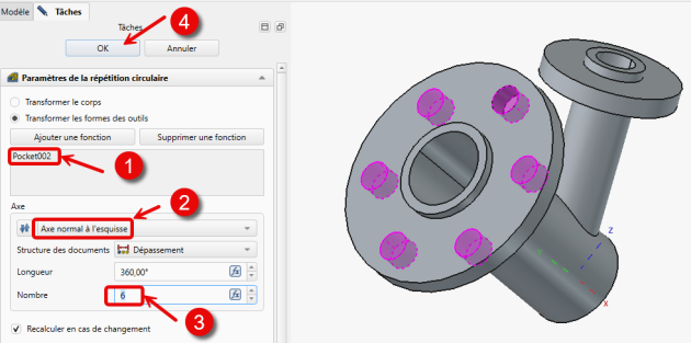 Trous sur la grande platineTâches à réaliser - Tâches à réaliser⚓Dans la vue Modèle, cliquer droit sur Corps et l'activer ;Sélectionner la face externe de la grande platine :Face à sélectionnerCréer l'esquisse ci-dessous :Esquisse à créerTâches à réaliser - Tâches à réaliser⚓Créer une cavité du type le plus proche à partir de cette esquisse ;Création de la cavité sur la grande platineCréer une répétition circulaire en sélectionnant la cavité que vous venez de créer avec 6 occurrences ;Répétition circulaire de la cavité Pocket002