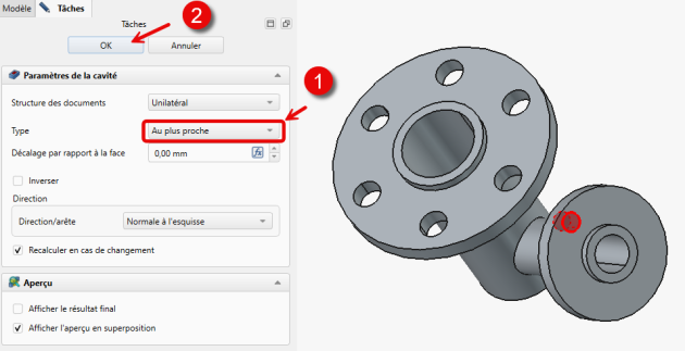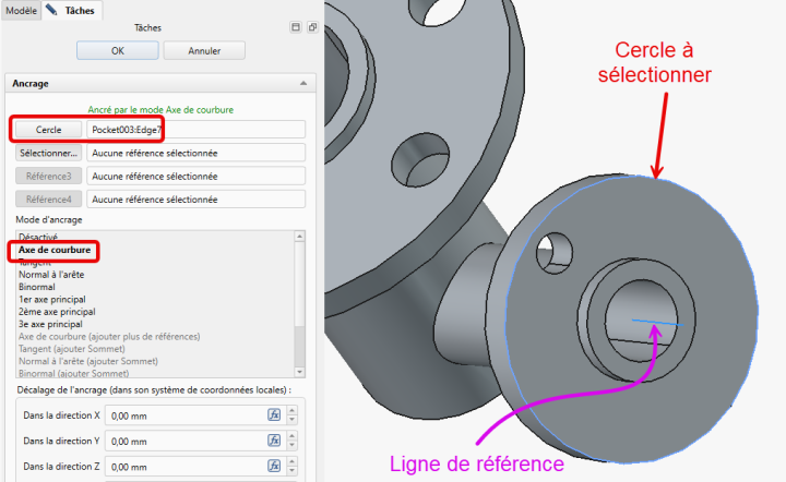 le plus procheà partir de cette esquisse ;Sélectionner le cercle externe de la petite platine et créer un ligne de référence