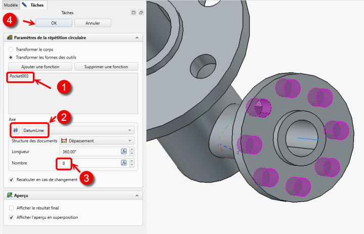 en sélectionnant la cavité créée avec 8 occurrences et en prenant la ligne de référence comme axe ;