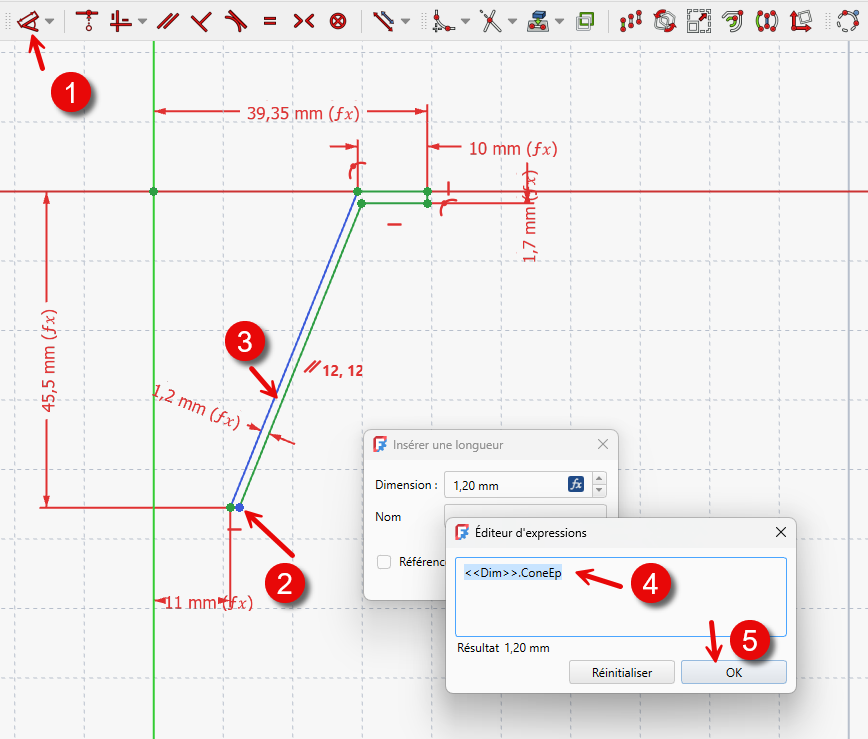 Dis: FreeCAD affiche la liste des alias qui commence par Dis : sélectionner l'alias souhaité à l'aide des flèches du curseur ;