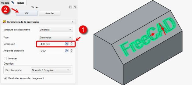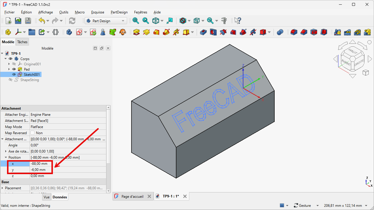 Centrer le mot FreeCAD en jouant sur l'attachement de l'esquisse ;