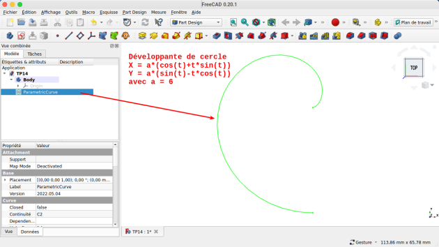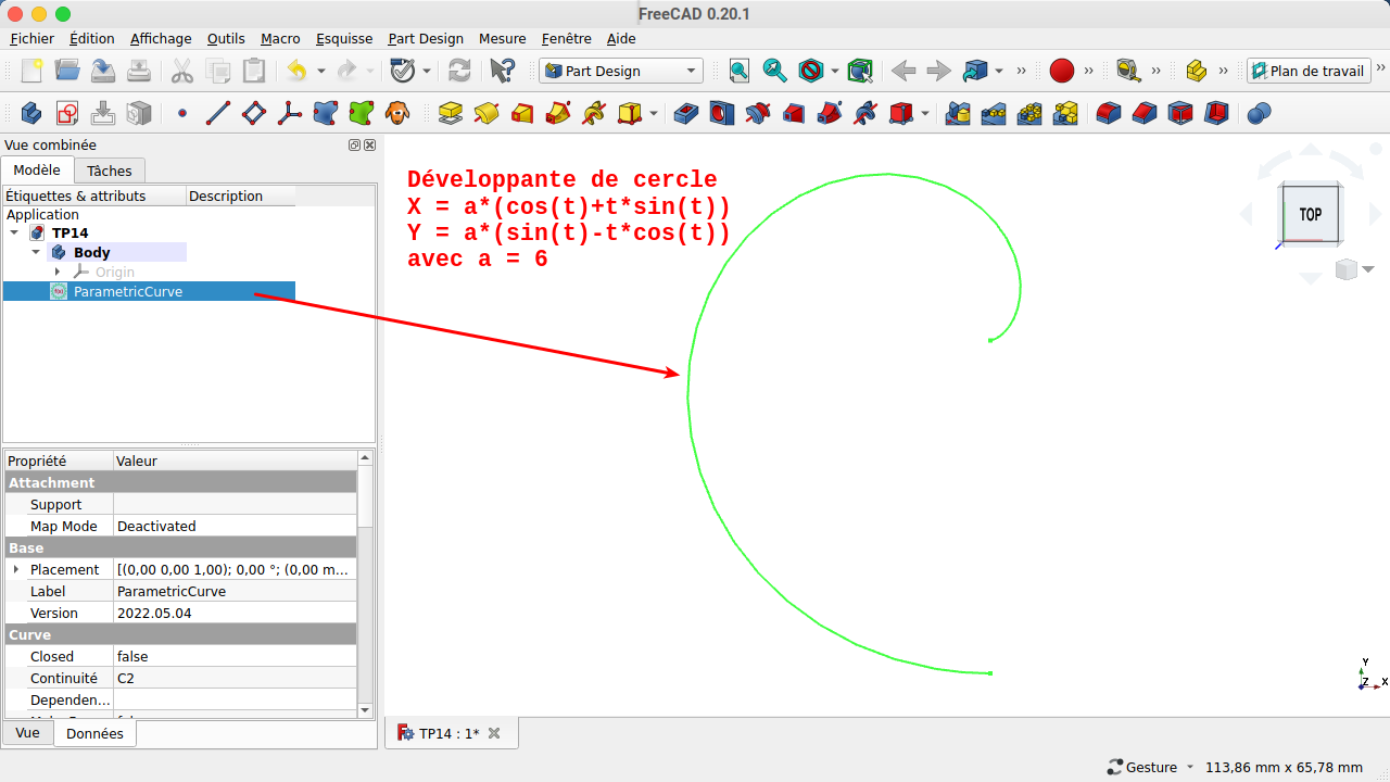 Exécuter la macroTâches à réaliser - Tâches à réaliser⚓Exécuter la macro , modifier la formule para_curve avec les paramètres suivants :a : 6X : a*(cos(t)+t*sin(t)) Y : a*(sin(t)-t*cos(t)) t_min : 0.0interval : 0.1t_max : 2*pi