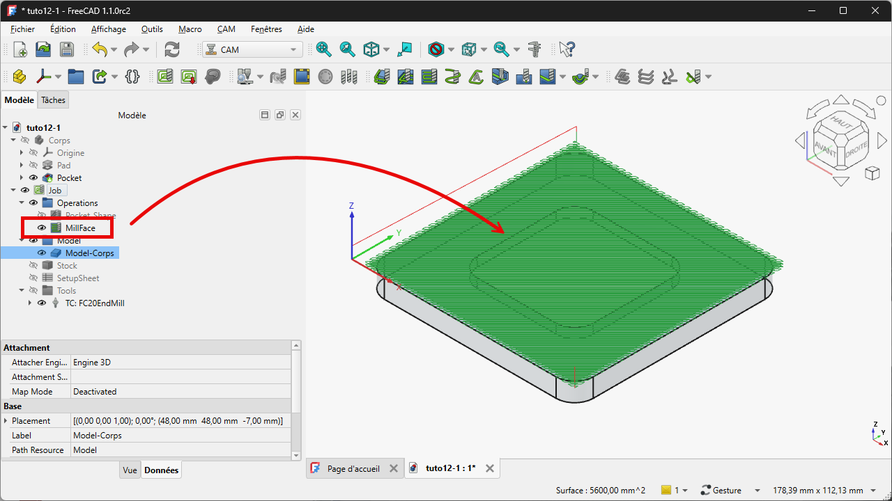 FreeCAD a ajouté un élément MillFace dans le sous-dossier