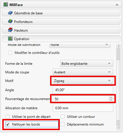 Opération, saisir un motifZigzag, unpourcentage de recouvrementde50et cochernettoyer les bords;